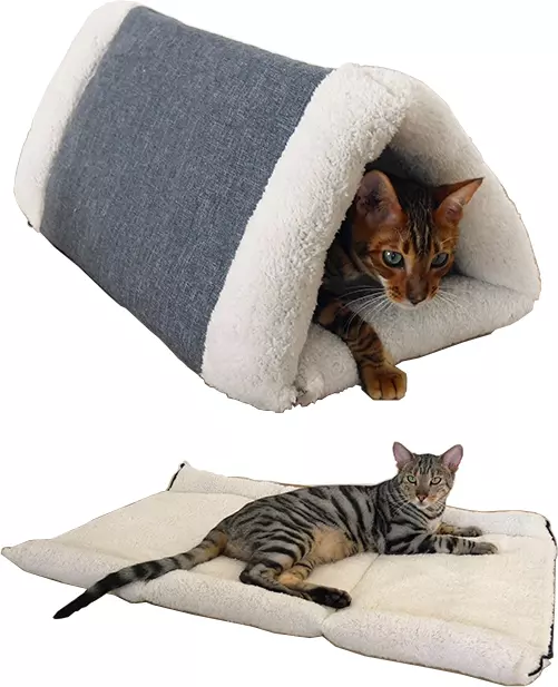 40 Winks 2 in 1 Cat Comfort Den combines style with comfort. Its super soft material will keep the cat warm and cosy. It effortlessly unfolds from a pyramid to a full size snuggly blanket with zip. Thick outside material keeps its shape.