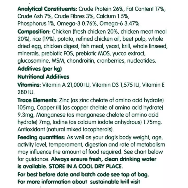 - Chicken (fresh chicken 20%, chicken meat meal 20%), rice (19%), potato, refined chicken oil, beet pulp, whole dried egg, chicken digest, fish meal, yeast, krill, whole linseed, minerals, prebiotic FOS, prebiotic MOS, yucca extract, glucosamine, MSM, chondroitin, cranberries, nucleotides.