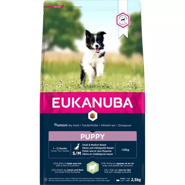 NEW EUKANUBA Puppy (Small Medium) Rich in Lamb & Rice with a hint of Turmeric, will transform your dog’s dinner time thanks to our delicious and 100% natural, grass-fed lamb. Full of pure taste, we’ve combined mouth-watering meat with high quality ingredients dogs love, making it perfect for even the fussiest of senior dogs.