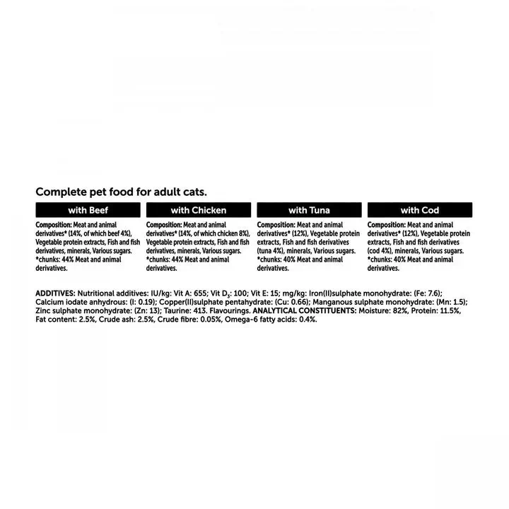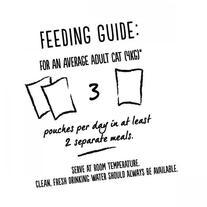 For an average adult cat (4kg), feed 3 to 4 pouches per day in at least 2 separate meals. The adult maintenance averages are based on moderately active cats at normal environmental temperatures. Individual needs vary and feeding should be adjusted as required to maintain your cat at a lean, healthy body weight. Serve at room temperature. Clean, fresh drinking water should always be available.