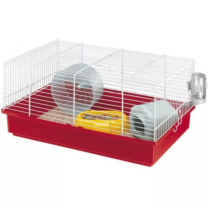 This cage comes complete with a nest, a feeding bowl, a drinking bottle and a wheel.