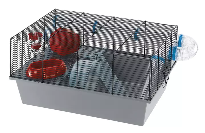 The Ferplast Micky / Milos Large cage is made from solid metal wire with a plastic base, and is suitable for mice and hamsters. It comes complete with all the accessories you need to get started, including a shelf, ladder, wheel, nest and transparent tubes.