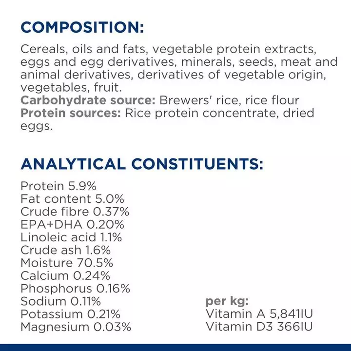 - Protein 5.9%, Fat content 5.0%, Crude fibre 0.37%, EPA+DHA 0.20%, Linoleic acid 1.1%, Crude ash 1.6%, Moisture 70.5%, Calcium 0.24%, Phosphorus 0.16%, Sodium 0.11%, Potassium 0.21%, Magnesium 0.03%;