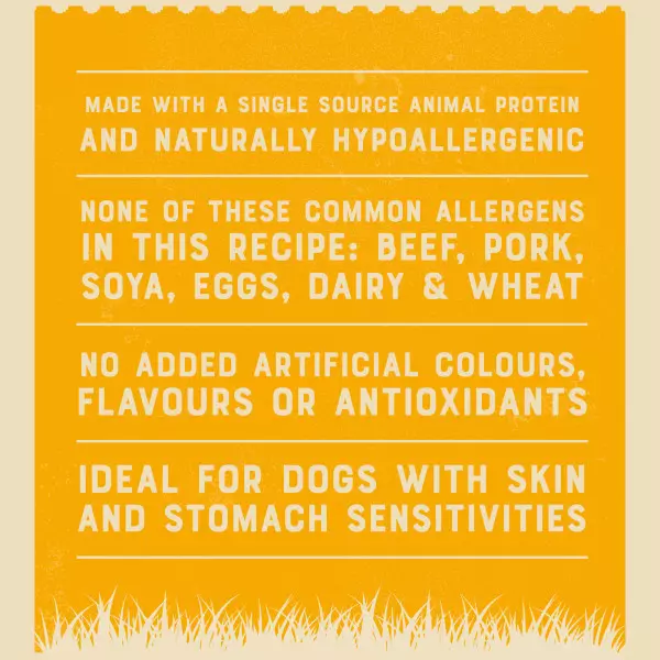 - Hypoallergenic – No beef, pork, soya, eggs, wheat or dairy.