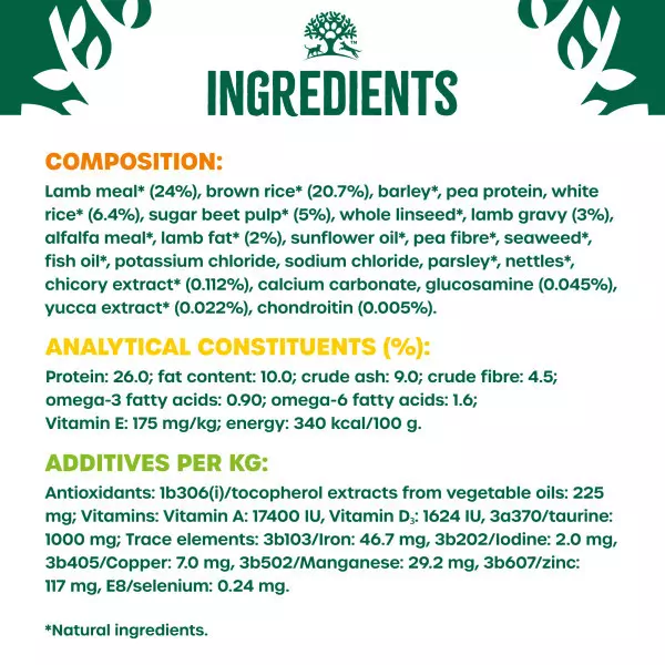 - lamb meal (24%), brown rice (20.7%), barley, pea protein, white rice (6.4%), sugar beet pulp, whole linseed, lamb gravy (3%), alfalfa meal, lamb fat (2%), sunflower oil, pea fibre, seaweed, fish oil, potassium chloride, sodium chloride, parsley (0.125%), nettles (0.125%), chicory extract (0.112%), calcium carbonate, glucosamine (0.045%), yucca extract (0.022%), chondroitin (0.005%), green tea extract (0.004%), pomegranate extract (0.001%), rosemary extract (0.001%).
