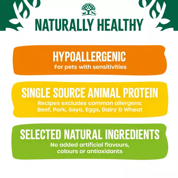 - Excludes common allergens beef, pork, soya, eggs, dairy and wheat;
