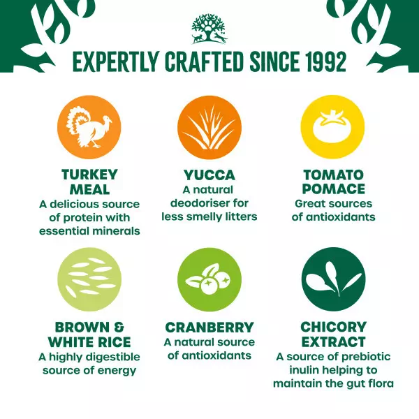 We’ve taken a handful of nature’s nourishing ingredients and combined them with flavourful turkey for highly digestible, quality protein dry cat food.