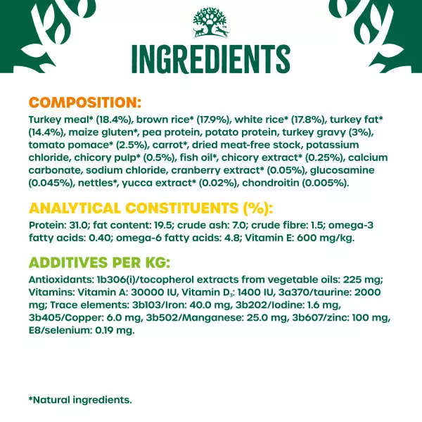 - turkey meal (18.4%), brown rice, white rice, turkey fat (14.4%), maize gluten, pea protein, potato protein, turkey gravy (3%), tomato pomace, carrot, dried meat-free stock, potassium chloride, chicory pulp, fish oil, chicory extract (0.25%), calcium carbonate, sodium chloride, cranberry extract (0.05%), glucosamine (0.045%), nettles (0.025%), yucca extract (0.02%), rosemary extract (0.006%), chondroitin (0.005%), green tea extract (0.003%), pomegranate extract (0.001%).
