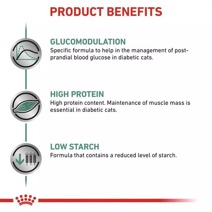 Specific formula utilising cereals with a low glycaemic index and selected fibres to help in the management of post-prandial blood glucose in diabetic cats.|Helps reduce net energy supply and maintenance of muscle mass essential in diabetic cats.|Formula that contains a reduced level of starch to help limit postprandial blood glucose.