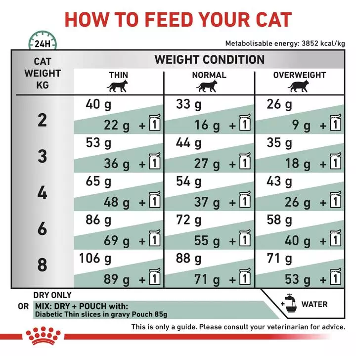 As part of the ROYAL CANIN® Veterinary Range, it is important that this product is only given to your pet when recommended by a veterinary professional. To cater to each cat’s individual preferences, ROYAL CANIN® Feline Diabetic is also available as wet food. Mixed feeding can be beneficial for your Diabetic cat to encourage a regular and consistent food intake, but it is essential that you follow our feeding guidelines to ensure your cat gets an accurate amount of both wet and dry food for complete nutrition.