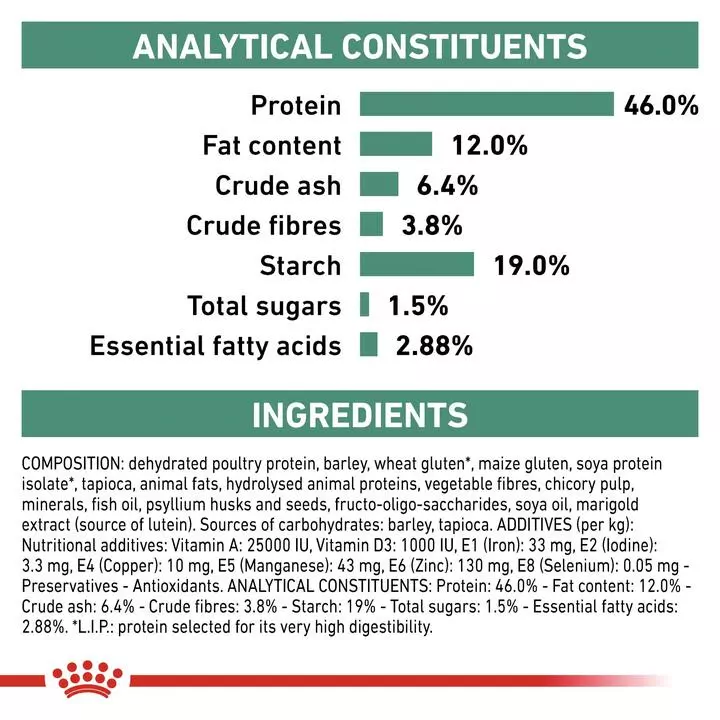 Dehydrated poultry protein, barley, wheat gluten*, maize gluten, soya protein isolate*, tapioca, animal fats, hydrolysed animal proteins, vegetable fibres, chicory pulp, minerals, fish oil, psyllium husks and seeds, fructo-oligo-saccharides, soya oil, marigold extract (source of lutein). Sources of carbohydrates: barley, tapioca. Crude ash: 6.4%. Crude fibre: 3.8%. Crude oil fats: 12%. Moisture: %. Protein: 46%.