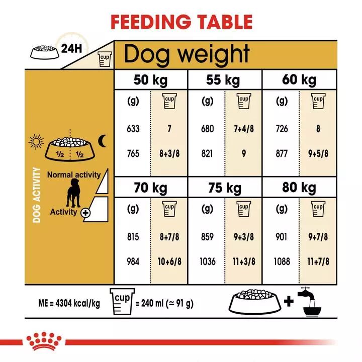 What’s more, with a body that typically consists of approximately 80% muscle mass, the Great Dane has energy needs that are (on average) 50% higher than other dogs in its class. That’s why ROYAL CANIN® Great Dane Adult contains an adequate energy content to meet the high energy needs of this breed, without overloading its stomach. However, it is important to divide the daily ration into at least two meals in order to help maintain good digestive function.