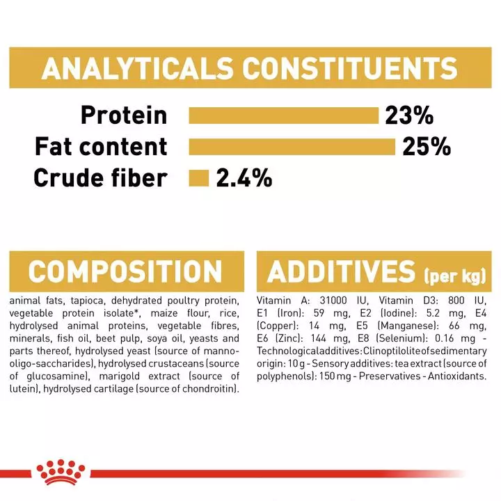 Animal fats, tapioca, dehydrated poultry protein, vegetable protein isolate*, maize flour, rice, hydrolysed animal proteins, vegetable fibres, minerals, fish oil, beet pulp, soya oil, yeasts and parts thereof, hydrolysed yeast (source of manno-oligo-saccharides), hydrolysed crustaceans (source of glucosamine), marigold extract (source of lutein), hydrolysed cartilage (source of chondroitin). Crude ash: 6.6%. Crude fibre: 2.4%. Crude oil fats: 25%. Moisture: %. Protein: 23%.