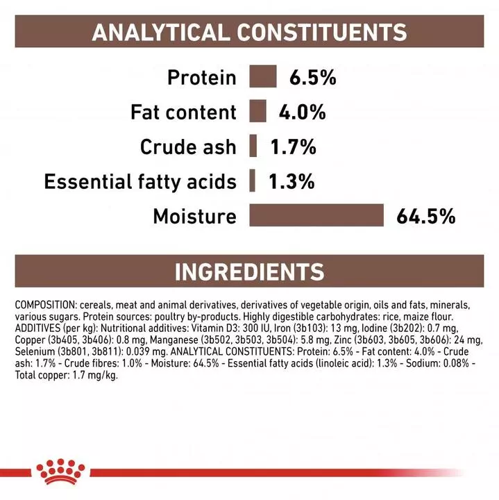 - Analytical constituents – Protein: 6.5% – Fat content: 4.2% – Crude ash: 1.5% – Crude fibres: 2% – Moisture: 64% – Sodium: 0.05% – Omega 6 essential fatty acids: 1.6% and Omega 3 essential fatty acids: 0.01% – Total copper: 2.9 mg/kg.