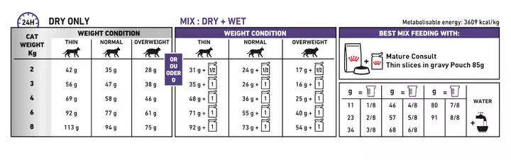 In order to meet the needs of more active mature cats, ROYAL CANIN® Mature Consult is formulated with a specially adapted energy content.